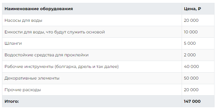 В таблице выше указаны цифры с ориентацией на среднемасштабное производство фонтанов со штатом из 2 мастеров. Конченый размер вложений зависит от стартовой базы. К примеру, инструменты у человека уже могут быть в наличии, а часть декораций с легкостью делается из строительных отходов.