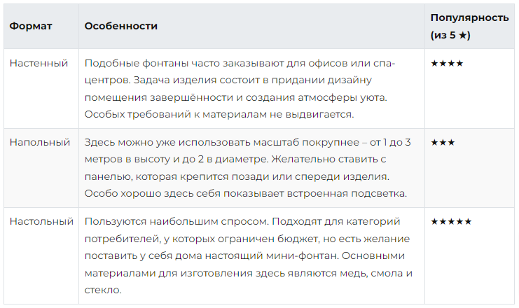 Бизнес-идея производства, продажи и монтажа комнатных фонтанов обязана учитывать всевозможные вариации исполнения, потому следует заранее продумать по 10-20 дизайнов для настенных, напольных и настольных категорий изделий. Об особенностях каждого формата расскажет таблица ниже.