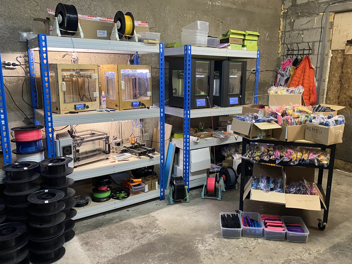 С ростом числа заказов мы перенесли производство в отдельное помещение и масштабировались. Над изготовлением рукояток для скакалок сейчас трудятся несколько принтеров, также печатаем фиксаторы для шнуров и оснастку для быстрой сборки.