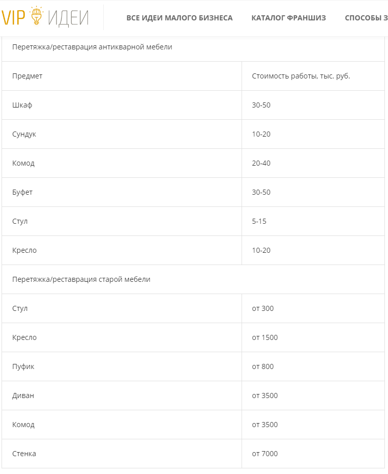 Итак, приведем предварительные расчеты цен услуг по перетяжке или реставрации старой или антикварной мебели. Надо сказать, что приведенные здесь данные не включаю в себя стоимость материалов. Как правило, именно эта дополнительная сумма берется в виде аванса с клиента при оформлении заказа. Опытные люди в сфере бизнеса рекомендуют дополнительные услуги, в которые можно включить пошив чехлов, подушек, замену наполнителя и составить отдельный прайс-лист.