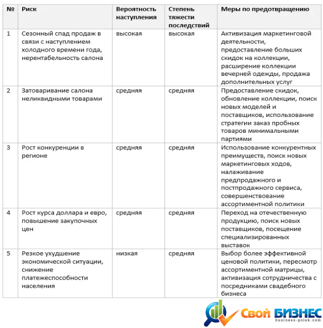 Главное только учитывать ряд негативных факторов, сопровождающих свадебный бизнес – рост конкуренции, сезонные спады продаж, риск купить неликвидную продукцию. Больше актуальных бизнес-планов и способов заработка реальных денег онлайн и оффлайн опубликовано в других разделах проекта Business-poisk. Также рекомендуем ознакомиться на нашей базой знаний, где содержится много полезных сведений для манимейкеров.