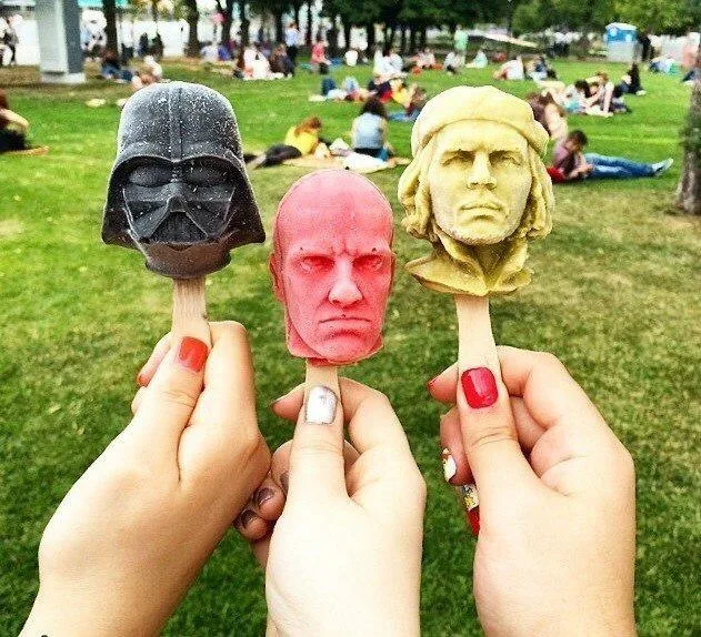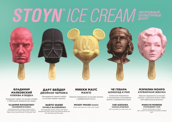 Мороженое в виде фигуры Маяковского было со вкусом водки с клюквой, фигура Мерлин Монро со вкусом клубники со сливками,фигура Че Гевары со вкусом мате и ром, Герой фильма"Звездные войны" был со вкусом черники с лакрицей.