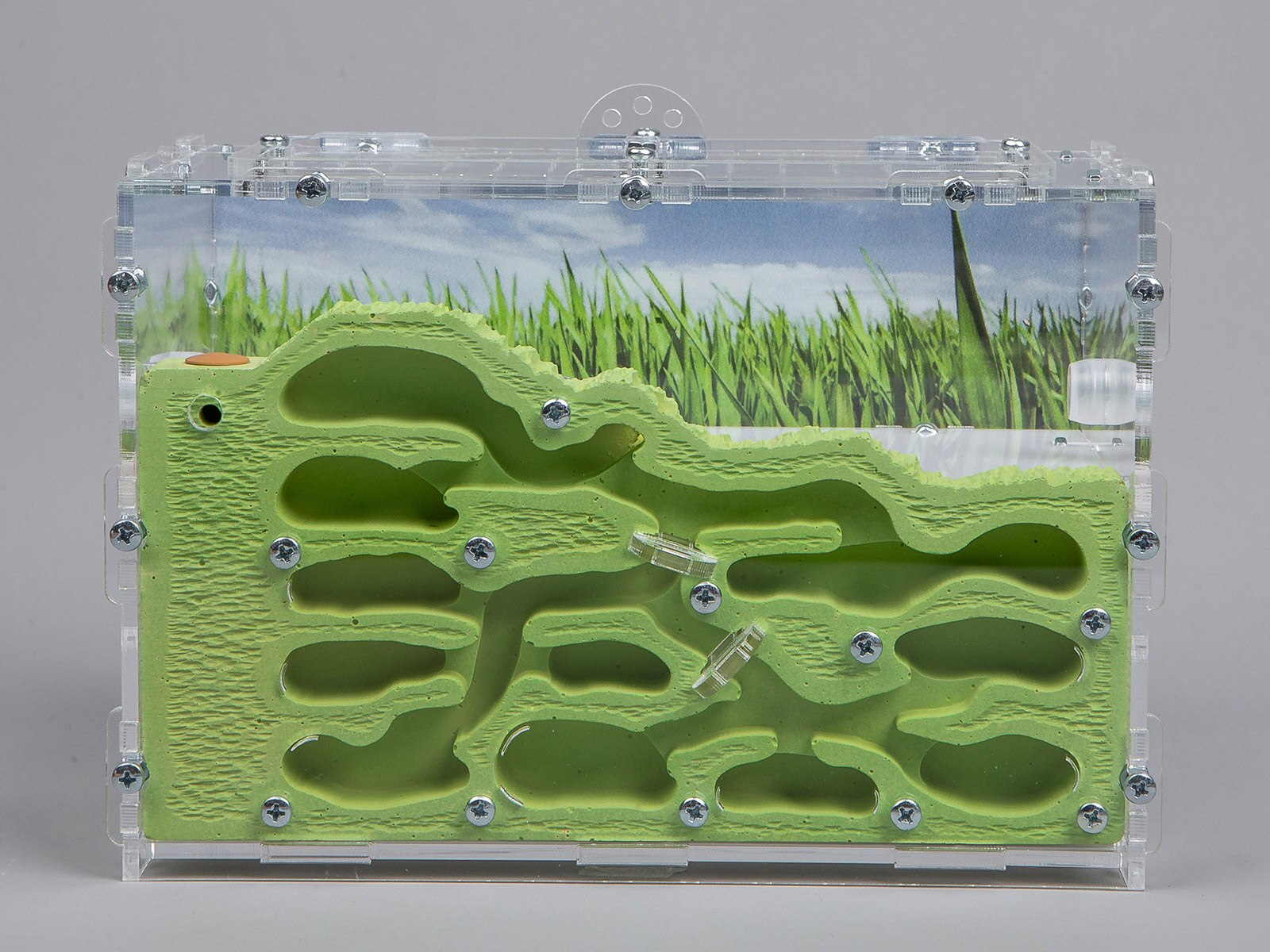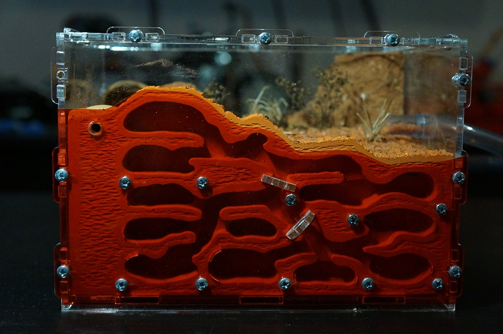 - Отверстие с пробкой для заселения и подключения дополнительной фермы. Чтобы начать колонию, муравьи должны быть заселены в гнездо. Для этого в гнезде предусмотрено отверстие с пробкой, которая может быть удалена для размещения муравьев или для подключения дополнительных ферм к существующей колонии.