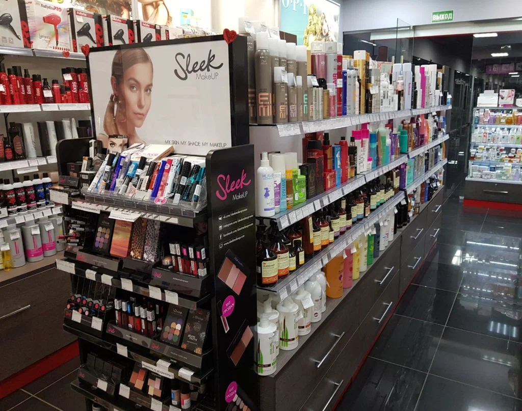 Вся продукция располагается согласно типу средства (стойки с декоративной косметикой, полки с парфюмерией и т. д.) или сортируется по брендам. Если магазин работает в формате самообслуживания, торговые зоны должны оснащаться открытыми витринами, стеллажами островного и пристенного типа. Если же планируется классический формат магазина, то потребуется установить специальные стеклянные витрины.