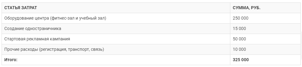 Вложения. Ваши стартовые условия определят и стартовые инвестиции. Существуют примеры, когда подобные проекты начинают и с практически нулевыми инвестициями до 50 тыс. рублей. Ниже приведем примерные затраты на открытие офлайн-курсов на два учебных зала - учебный и тренировочный, с созданием сайта и привлечением трех ключевых специалистов - акушера-гинеколога, психолога и фитнес-тренера. Обратите внимание, что в стартовые расходы не включены затраты на разработку обучающей программы.