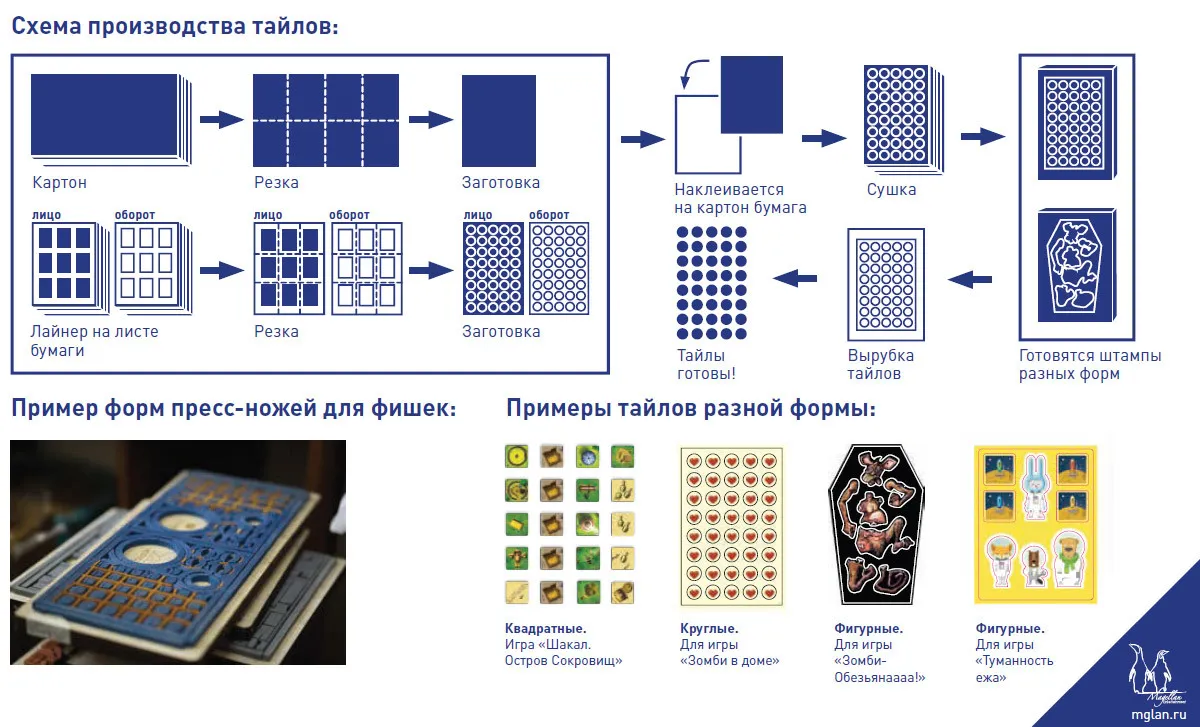 - Производственный процесс включает печать, каширование, вырубку и сборку игры. Влияние на стоимость оказывают такие факторы, как размер тиража (при росте тиража стоимость единицы продукции существенно снижается); материалы, используемые в игровом процессе (дешевые варианты включают карты, коробку и инструкцию, дорогие - элементы из дерева, пластика, металла и сложные компоненты); варианты упаковки (от простой до эксклюзивной).
