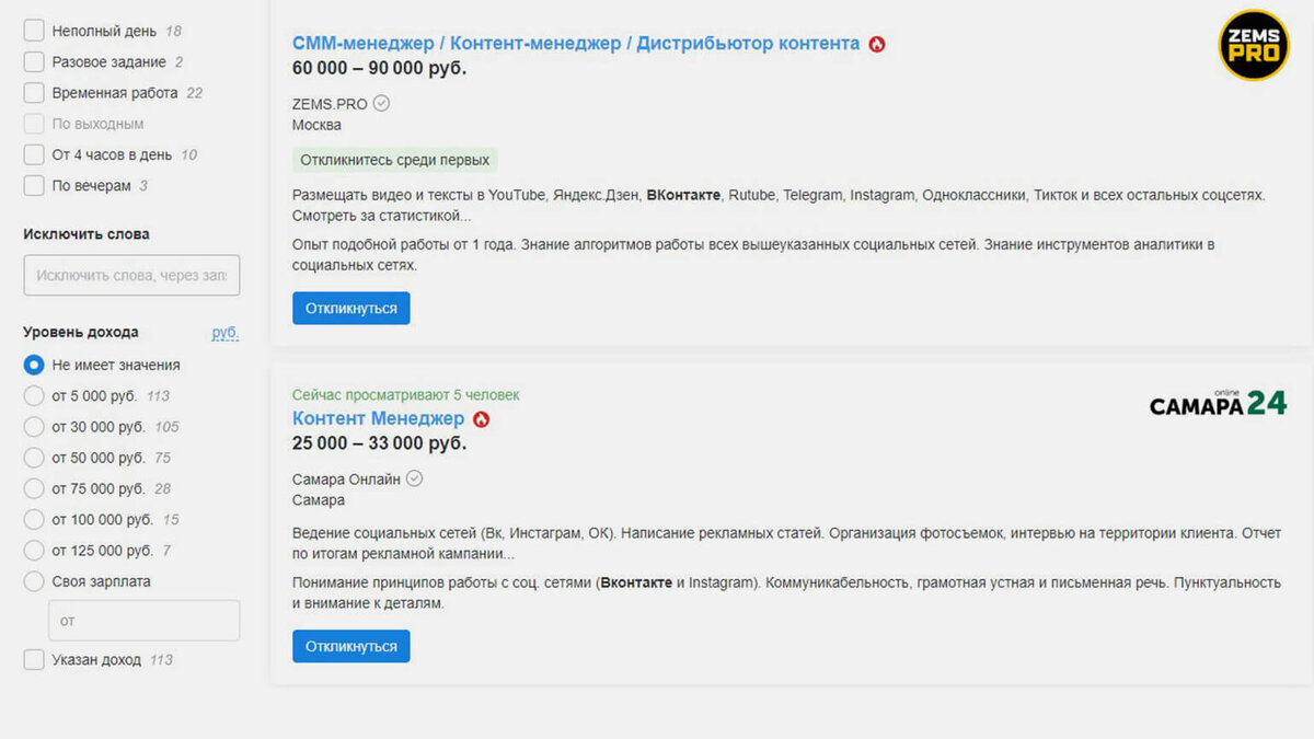 Контент-менеджер. Это человек, который управляет созданием и публикацией контента. Его обязанности могут различаться в зависимости от потребностей клиента. Чаще всего контент-менеджер составляет контент-планы, ставит задачи исполнителям и публикует контент. Средний заработок при таком наборе обязанностей — 40–50 тысяч рублей в месяц.