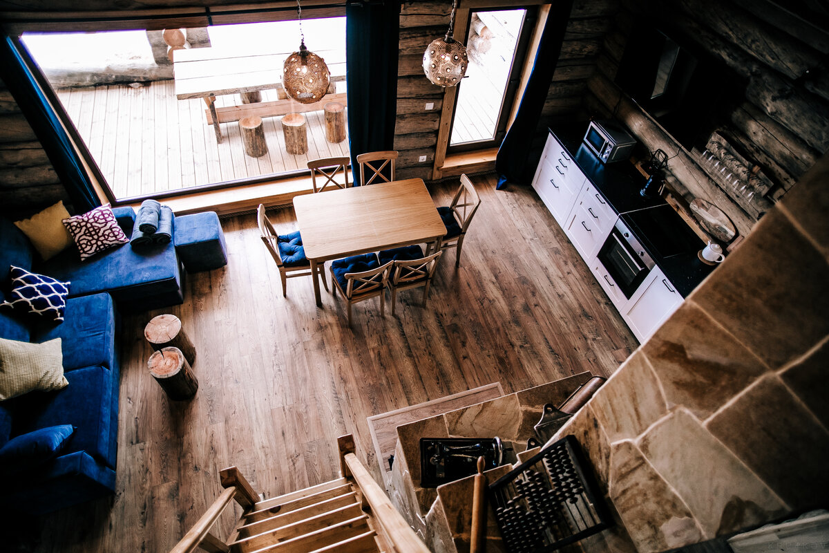 - Вместимость — до восьми человек. В каждом доме — две спальни на первом этаже + одна мансардная + два спальных места в гостиной