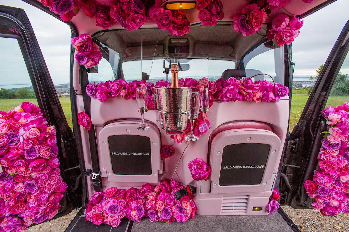 Компания L’Oreal придумала оригинальную акцию для рекламы парфюмерного аромата FlowerbombSurprise от Victor & Rolf, создав брендированное цветочное такси. Дизайн кузова такси полностью повторяет флакон фирменных духов, а салон отделан розовой замшевой обивкой и более 1000 цветами.