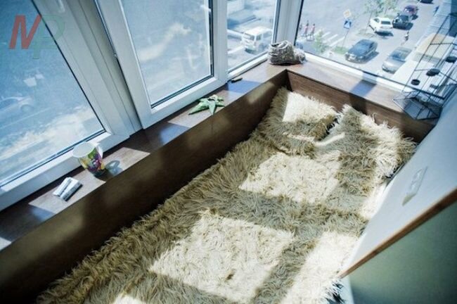 - Мягкий балкон для релакса и чайных церемоний - тут главной задачей является создание расслабляющей обстановки, установка мягкой мебели и коврового покрытия с длинным ворсом. Иногда делают все свободное пространство балкона как одна большая кровать.