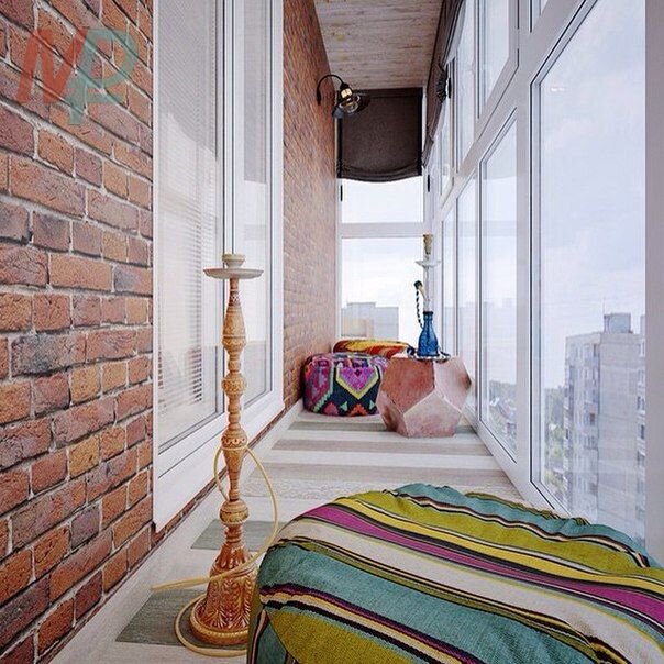 - Кальянная на балконе - очень популярный вид отделки балкона, который подразумевает установку двух кресел по две стороны от столика, на который ставится кальян. Декоративные решения тут обычно применяются в восточном стиле.