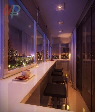 - Бар на балконе - вместо обычного подоконника устанавливается столешница барной стойки и к ней ставятся барные стулья.